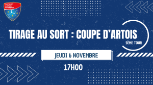 Nous vous annonçons que le tirage au sort du 5ème tour de la Coupe d’Artois se déroulera le jeudi 6 novembre 2025 et sera diffusé sur notre page Facebook à 17h.